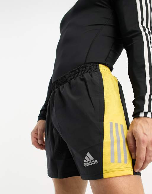 Adidas black sales yellow shorts, adidas Running Own The Run 5 inch shorts in black and yellow sales