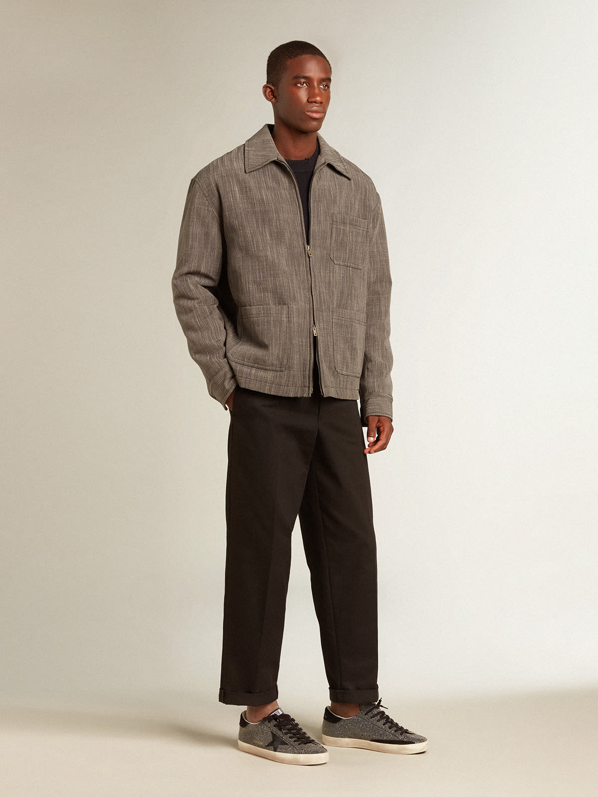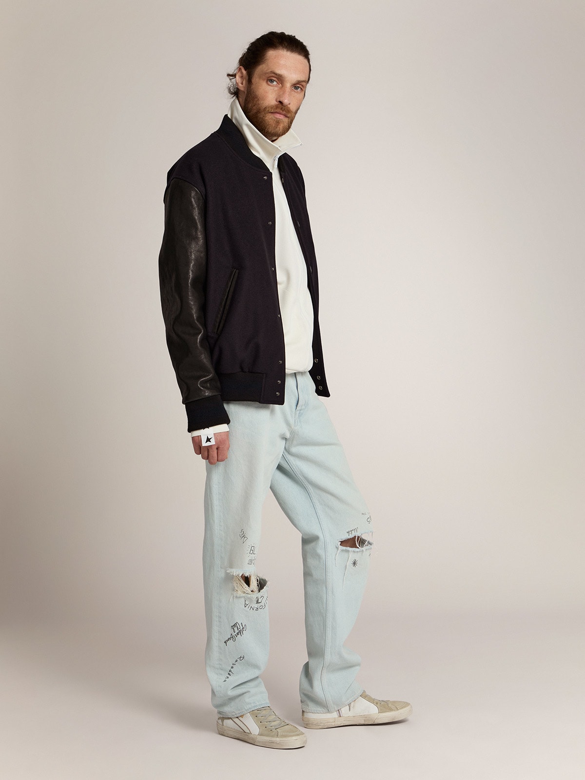 Men s bomber jacker in blue wool and black leather Golden Goose