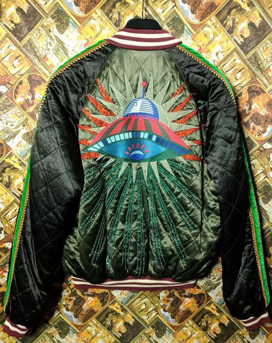 Gucci sales ufo jacket, Shop Gucci Ufo embroidered Satin Bomber Jacket In Green sales