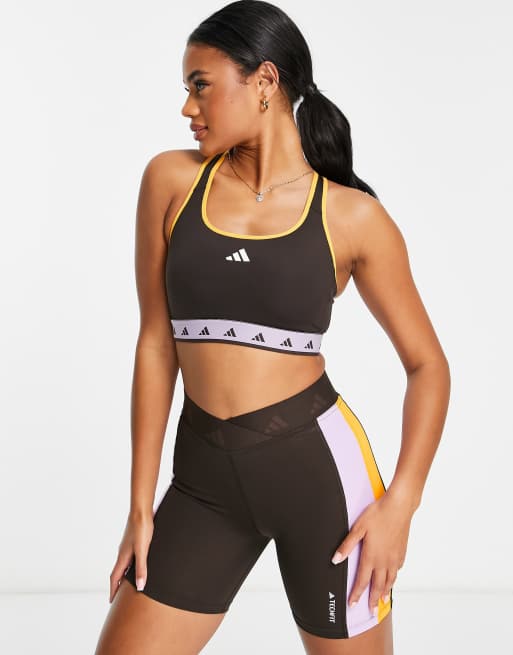 adidas Training Techfit Sport bh met medium ondersteuning en kleurvlakken in bruin oranje en paars
