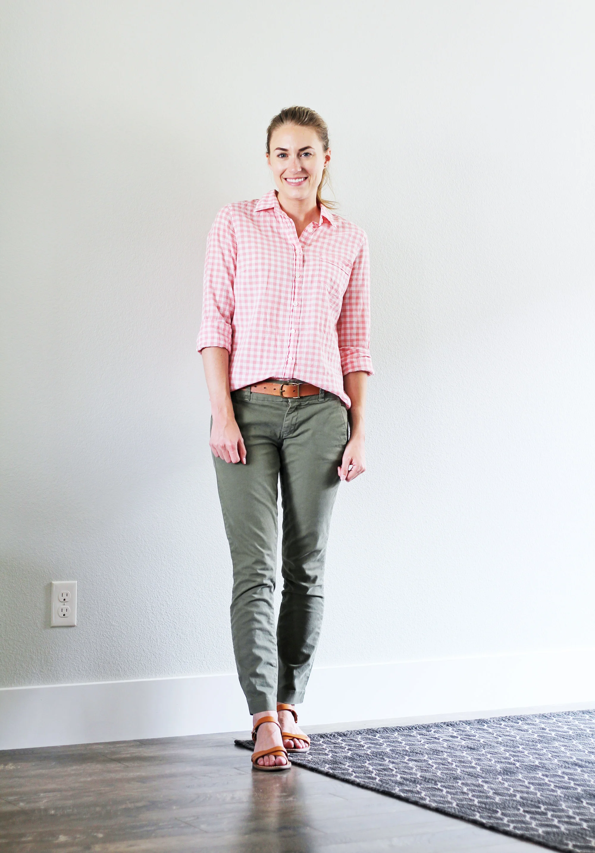 - olive green pants with pink shirt