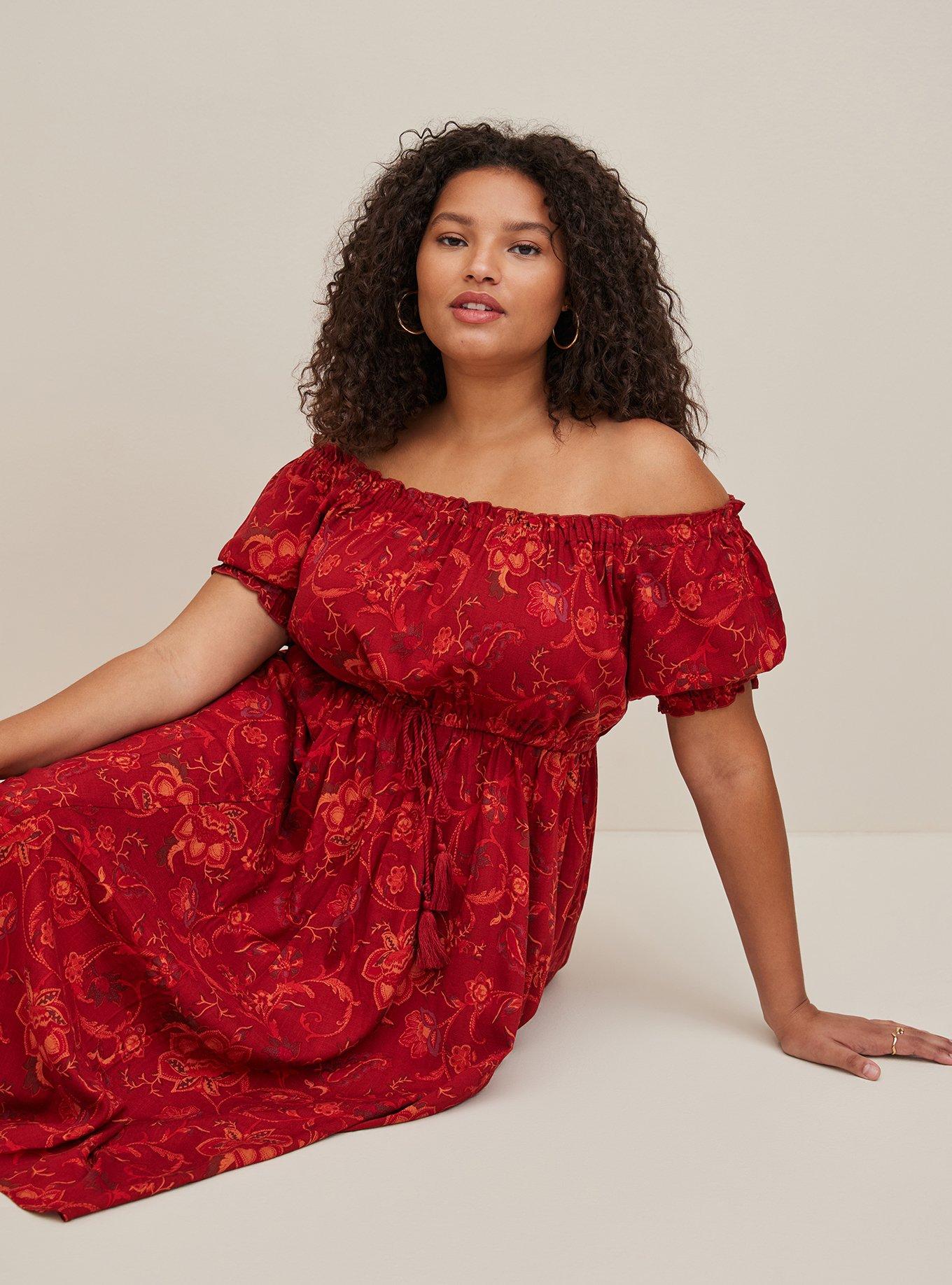 Plus Size Midi Rayon Twill Off Shoulder Peasant Dress Torrid