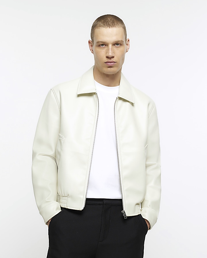 River island white sales leather jacket, Ecru regular fit faux leather jacket sales