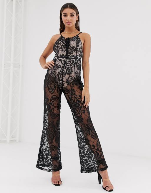 Amora black sales lace jumpsuit, Lasula plunge lace up jumpsuit in black baroque print ASOS sales