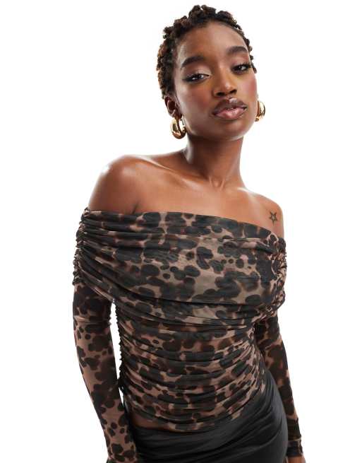 ASOS DESIGN bardot mesh long sleeve top in leopard printed mesh ASOS