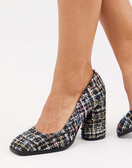 ASOS DESIGN Pinky square toe block heeled pumps in tweed ASOS