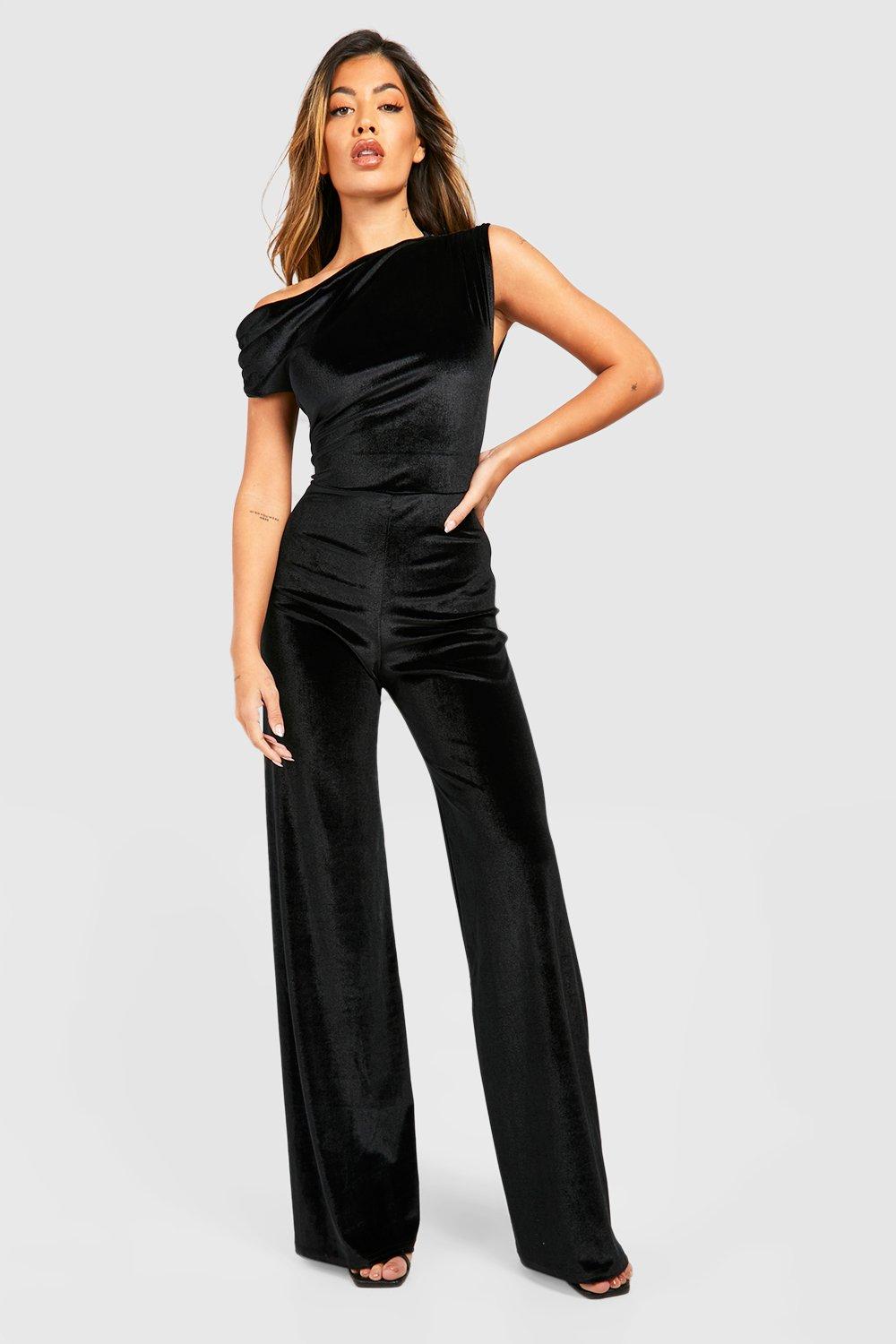 Velvet Drape Off Shoulder Wide Leg Jumpsuit