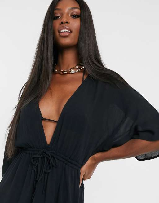 ASOS DESIGN TALL crinkle beach cover up with channel waist drape sleeves in black
