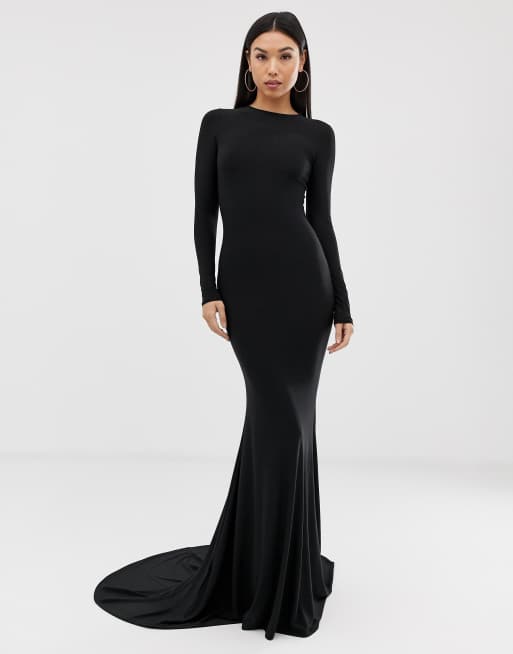 Asos black sales fishtail dress, Goddiva long sleeve assymetric fishtail dress in black sales