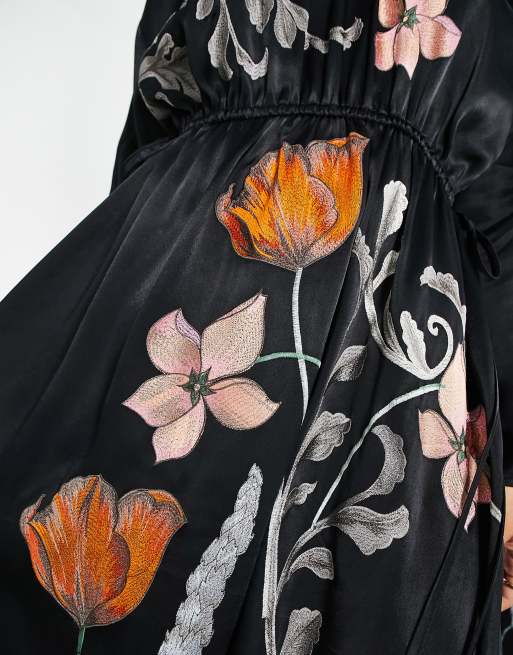 Asos black floral sales embroidered dress, ASOS EDITION floral embroidered satin midi dress with drawstring sales