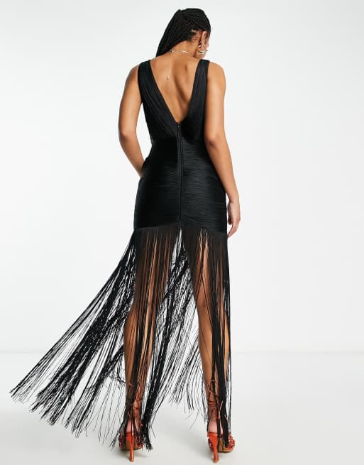 ASOS DESIGN drape fringe maxi dress with wrap detail in black