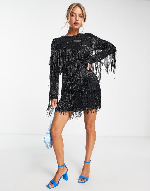 Asos black sales fringe dress, ASOS DESIGN embellished shift mini dress with beaded fringe in sales