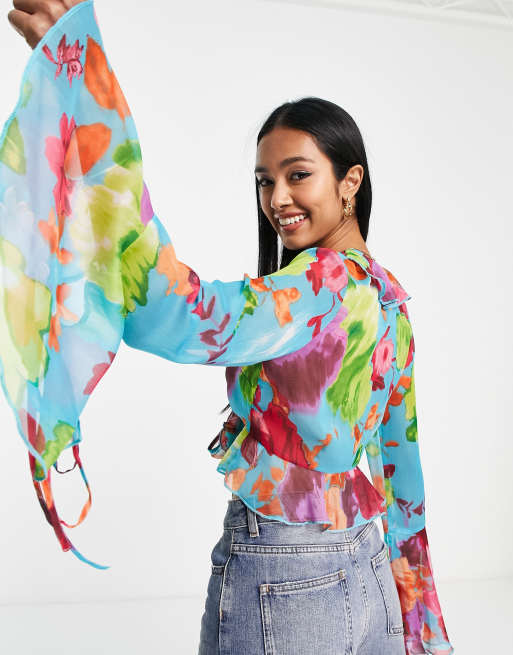 Asos blouses sales, ASOS DESIGN frill neck blouse with flare sleeve in denim print sales