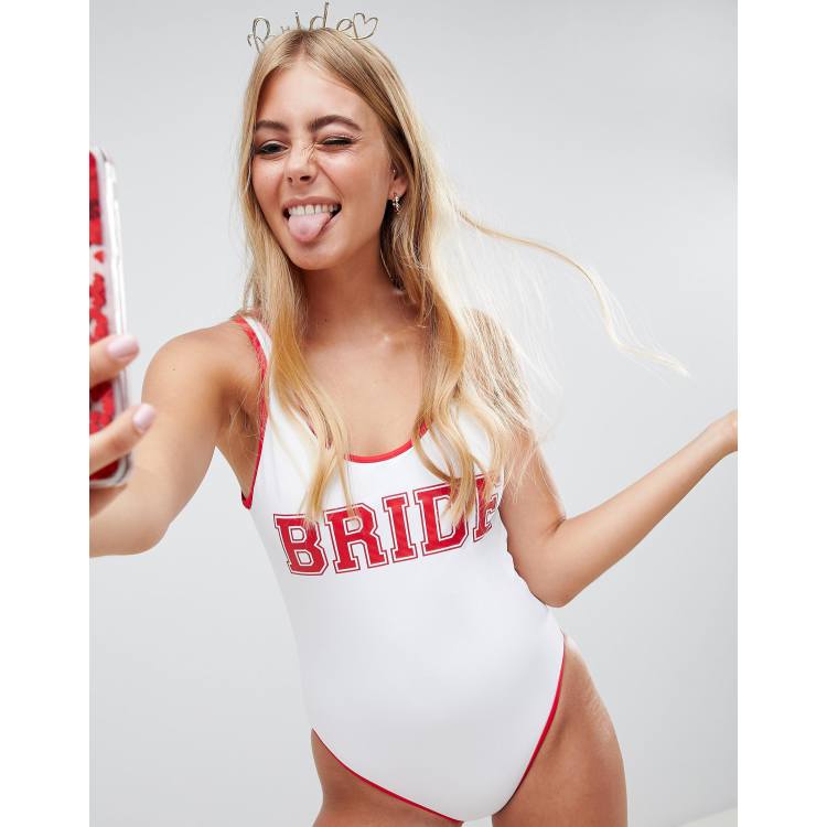 ASOS DESIGN bride slogan swimsuit with contrast bind in white