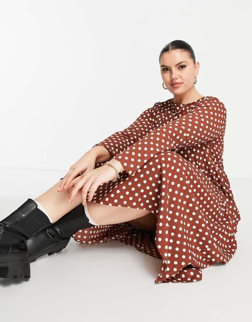 ASOS DESIGN Curve long sleeve tiered smock midi dress in brown spot