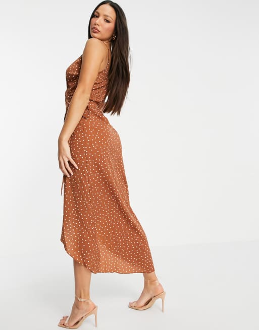 ASOS DESIGN Petite cami wrap midi dress in brown polka dot print
