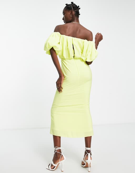 ASOS DESIGN off the shoulder puff detail midi dress in lemon ASOS