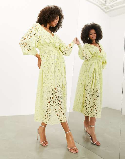 ASOS EDITION broderie wrap belted midi dress in lemon