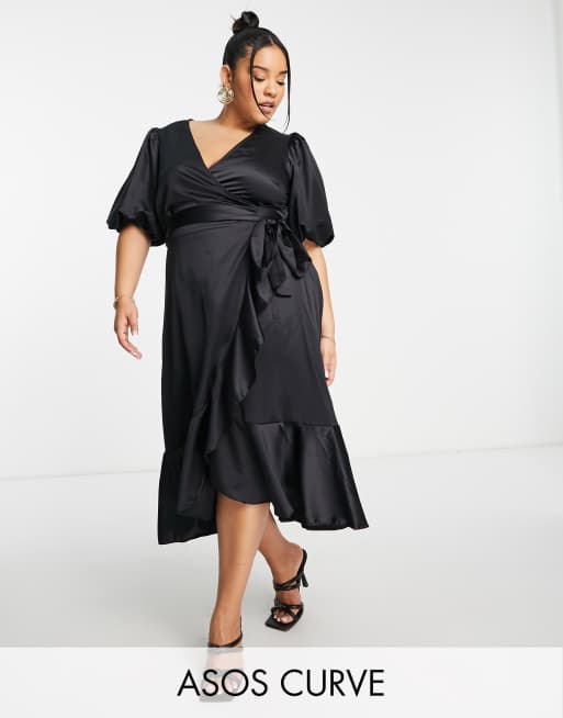 ASOS DESIGN Curve Edit satin midi wrap dress with puff sleeves in black