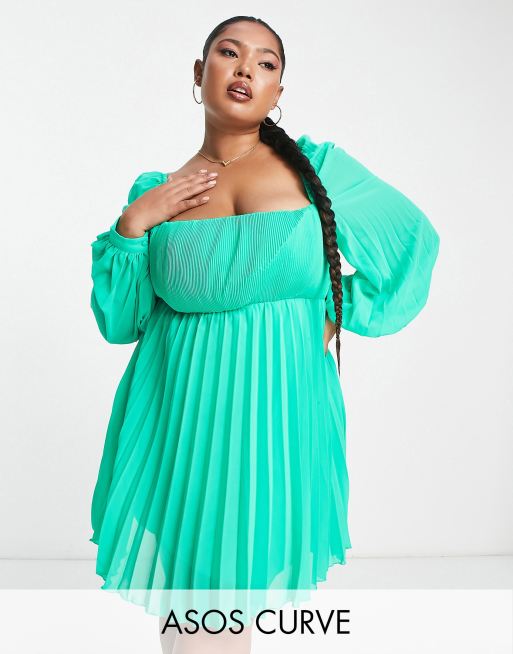 ASOS DESIGN Curve square neck pleated mini skater dress in emerald green