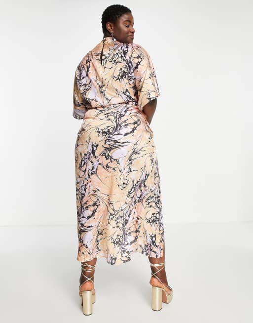 ASOS DESIGN Curve high neck grown on sleeve biased satin midi dress in marble print