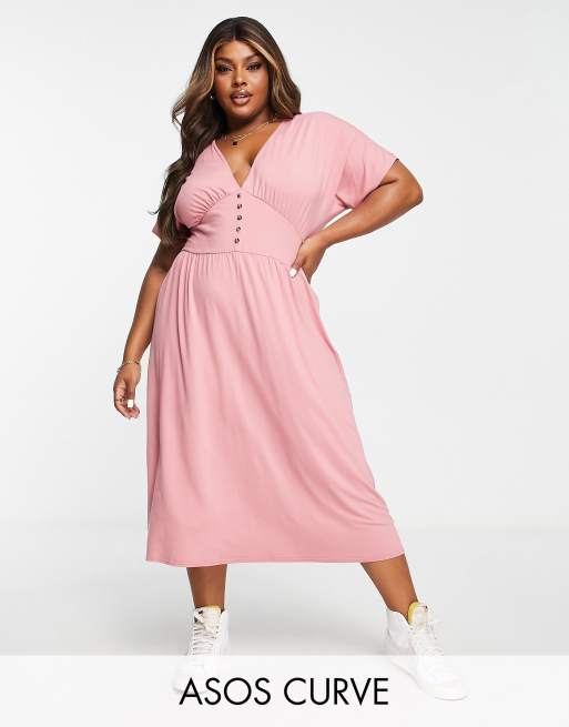 ASOS DESIGN Curve waisted midi tea dress with buttons in dusty pink