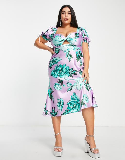 Asos curve sales tea dress, ASOS DESIGN Curve satin button through midi tea dress in green base floral print sales