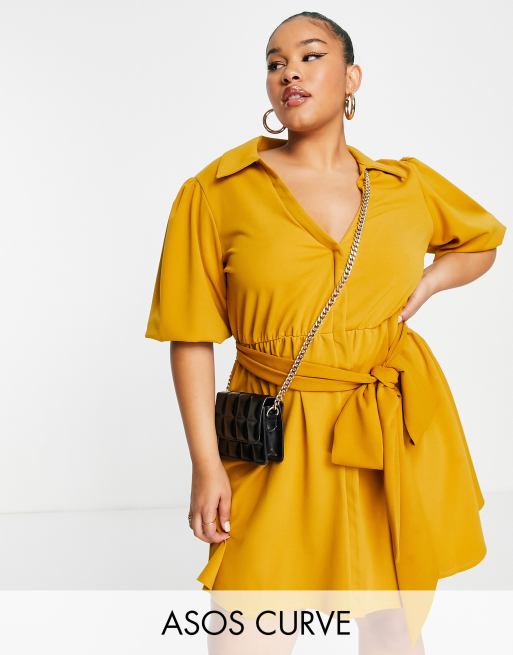Asos curve sales yellow dress, ASOS DESIGN Curve belted mini shirt dress in mustard sales