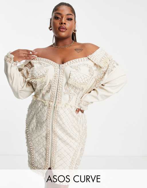 ASOS DESIGN Curve pearl embellished oversized denim off shoulder tux dress