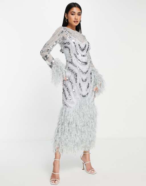 ASOS EDITION sequin wave midi dress with faux feather hem in ice blue