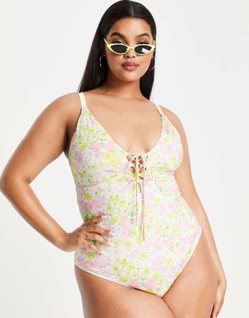 ASOS DESIGN Curve lace up swimsuit in ditsy floral print ASOS