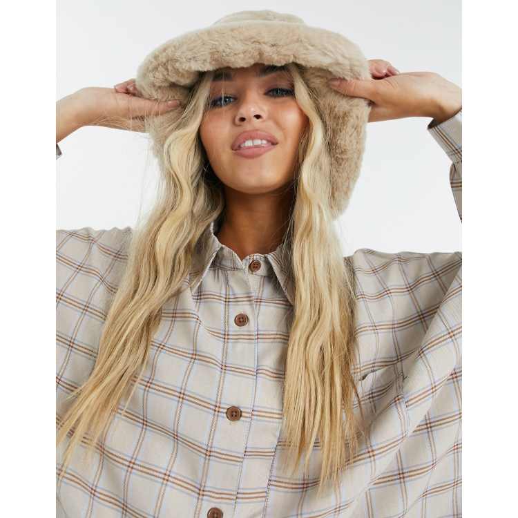 Asos fluffy sales bucket hat, ASOS DESIGN faux fur bucket hat in stone ASOS sales