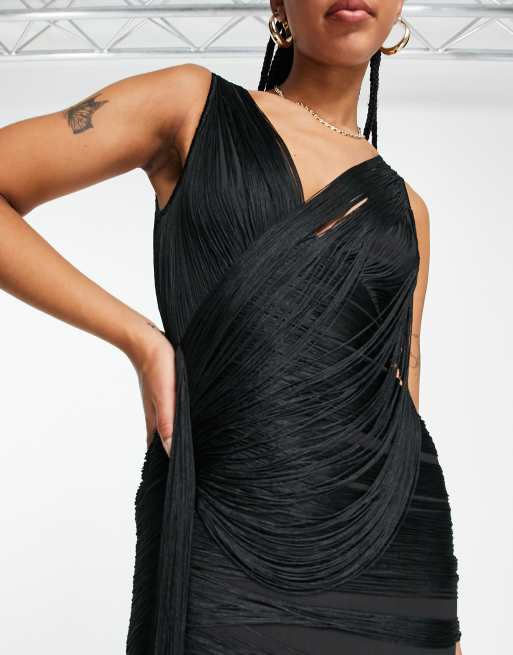 Asos fringe sales dress black, ASOS DESIGN drape fringe maxi dress with wrap detail in black sales