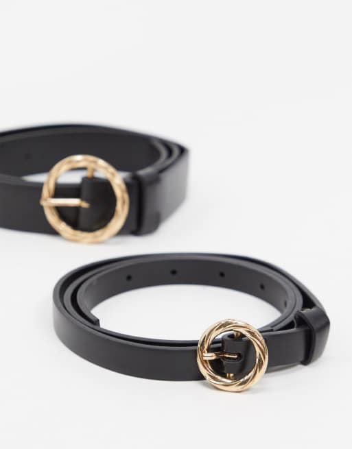 ASOS DESIGN 2 pack twisted buckle waist and hip belts in black