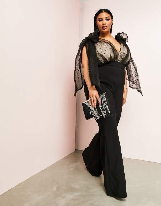 ASOS LUXE Curve kick flare jumpsuit with dobby tie shoulder detail in black