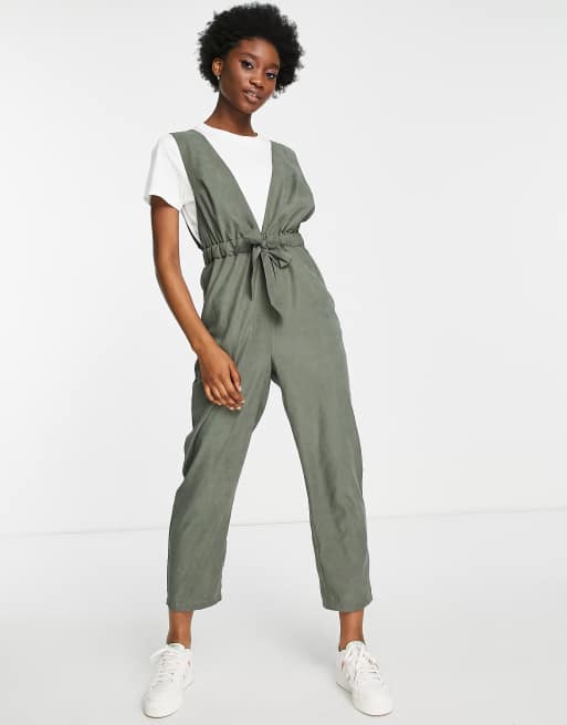 ASOS DESIGN cupro plunge drawcord waist jumpsuit in khaki