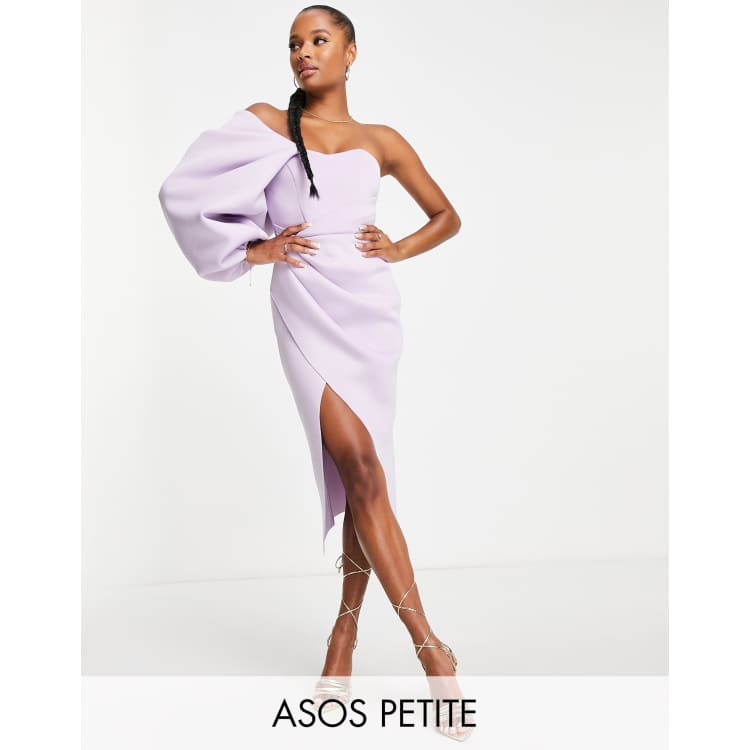 ASOS DESIGN Petite one sleeve off shoulder wrap tuck pencil midi dress in lilac