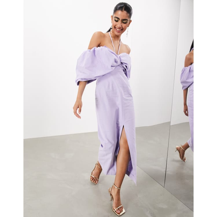 ASOS EDITION bardot bow tie neck detail midi dress in lilac ASOS