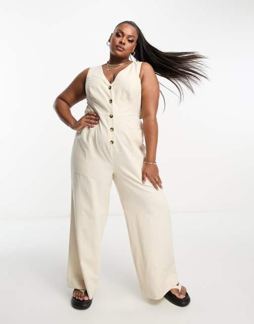 Asos sales linen jumpsuit, ASOS DESIGN Curve linen look button through jumpsuit in oatmeal sales