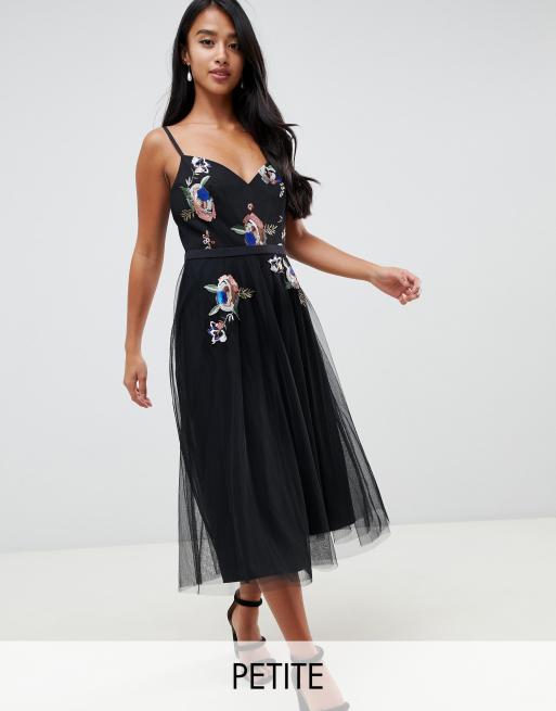Little Mistress Petite embellished bodice tulle midi dress in black
