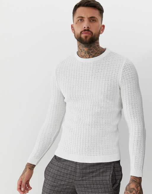 ASOS DESIGN muscle fit waffle textured jumper in white