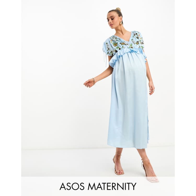 Asos maternity sales embroidered dress, ASOS DESIGN Maternity embroidered satin midi dress with frill waist in pale blue sales