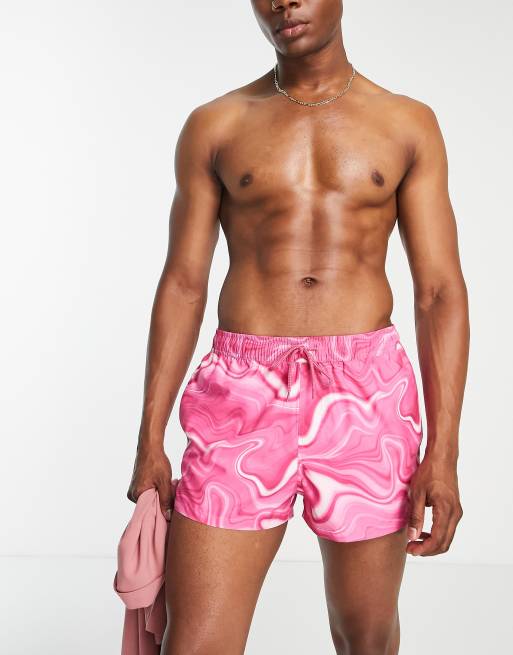 ASOS DESIGN swim shorts in super short length with marble print in pink