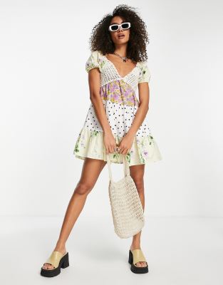 ASOS DESIGN crochet tiered babydoll mini dress in mixed print ASOS