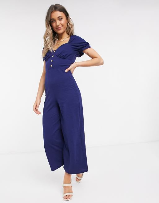 ASOS DESIGN bubble crepe v neck puff sleeve jumpsuit in navy