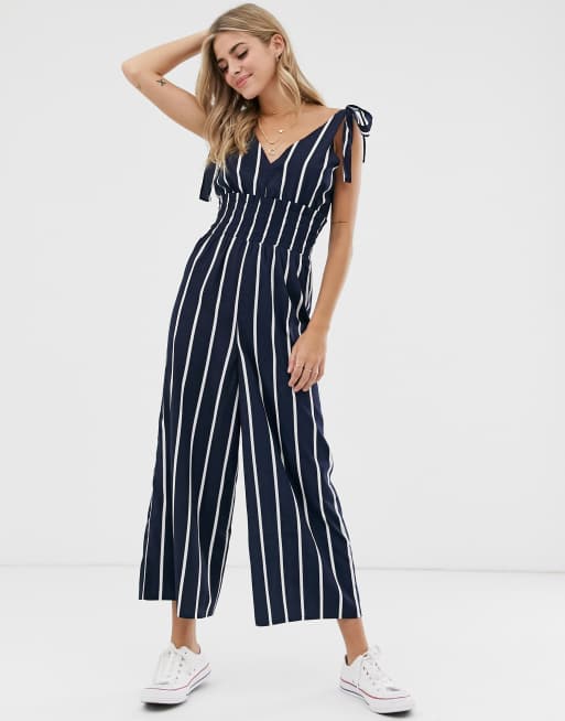 ASOS DESIGN shirred waist tie shoulder jumpsuit in navy white