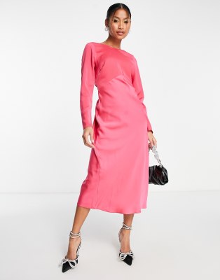 ASOS DESIGN satin long sleeve midi dress with drawstring back in pink