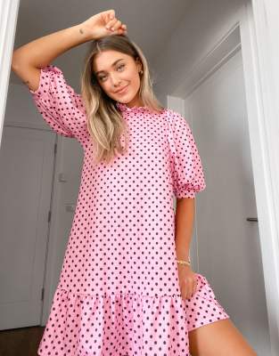 ASOS DESIGN textured mini dress with ruffle neck and puff sleeve in pink with black polka dot