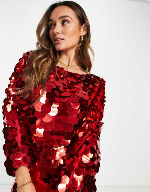 Asos red sales sequin dress, ASOS DESIGN slouchy embellished mini dress in red oversized disc sequin sales