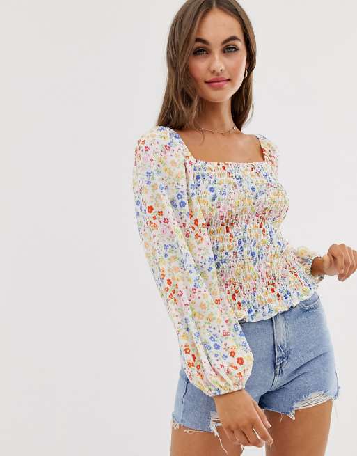 ASOS DESIGN shirred crop top with long sleeve in ditsy ASOS